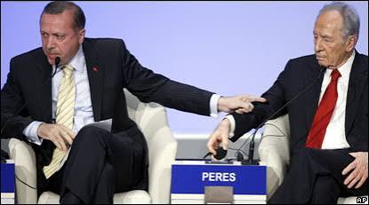 هذا السجال يذكرنا في سجال وقع بين الرئيس اردوغان حينما كان رئيسا لوزراء تركيا في مؤتمر دافوس عام ٢٠٠٩، حينما كان الرئيس الاسرائيلي الأسبق شمعون بيريز يدافع بشراسه عن عدوان إسرائيل على غزة في كانون الأول عام ٢٠٠٨م، حيث لم يعطي مدير جلسة الحوار الوقت الكافي للرد على شمعون بيريز ، وقال له :” حينما يتعلق الامر بالقتل فانتم تعرفون جيدا كيف تقتلون. وانا اعرف جيدا كيف قتلتم اطفالا على الشواطىء”. وأضاف : ” أشعر بالحزن عندما يصفق الناس لما قاله (بيريز) لأن عددا كبيرا من الناس قد قتلوا، وأعتقد أنه من الخطأ وغير الإنساني أن نصفق لعملية أسفرت عن مثل هذه النتائج”.