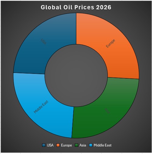 يوضح الرسم البياني ( خاص لمركز الروابط ) اختلاف أسعار النفط بين أربع مناطق رئيسية في عام 2026: الولايات المتحدة، أوروبا، آسيا، والشرق الأوسط. ورغم أن الفروقات تبدو صغيرة، إلا أنها تعكس اختلافات عميقة في العوامل الاقتصادية والجيوسياسية التي تشكل أسواق الطاقة العالمية.