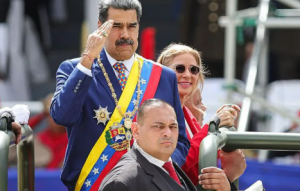 Getty Images President of Venezuela Nicolás Maduro, wearing a suit and the presidential sash, salutes as he arrives for a military parade as part of 214th anniversary of Venezuela’s independence celebrations on July 5, 2025 in Caracas, Venezuela. A man stands in front of him and Maduro’s wife, Cilia Flores, smiles behind him.